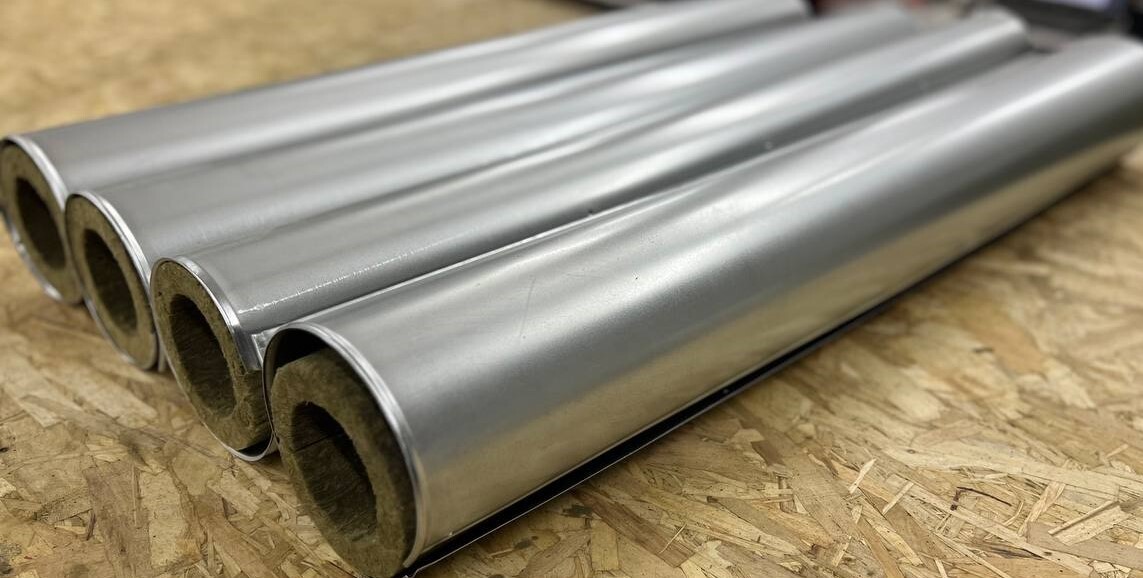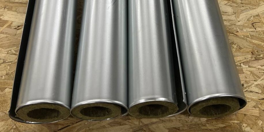 Процесс монтажа : Базальтовый цилиндр в окожушке раскрывается и одевается на трубу, место соединения оцинкованного покрытия фиксируют оцинкованными саморезами.
